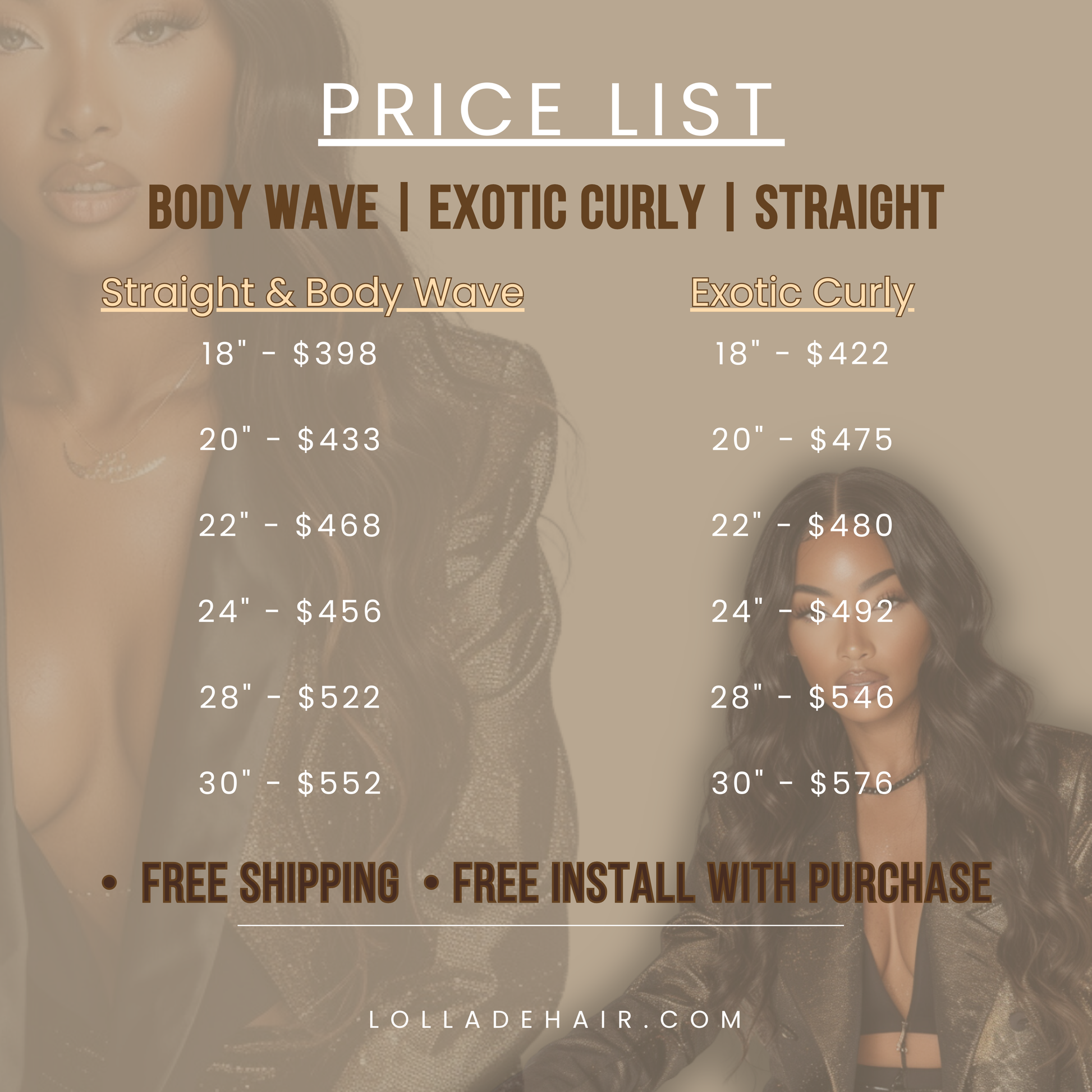 At Lollade Hair, we offer only the highest quality bundles in Straight, Body Wave, and Exotic Curly textures. Our hair is soft, full from root to tip, minimal shedding, and made to last whether you’re slaying a sleek look or voluminous curls.